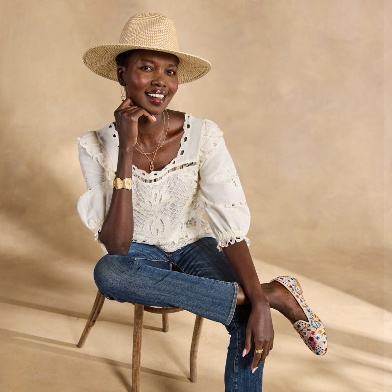 Elegance defines this stunning top with intricate embroidery and eyelet details. Elastic at the scalloped hem and ruffles at the shoulders. Square neckline. Cotton/linen. Hand wash. Imported.