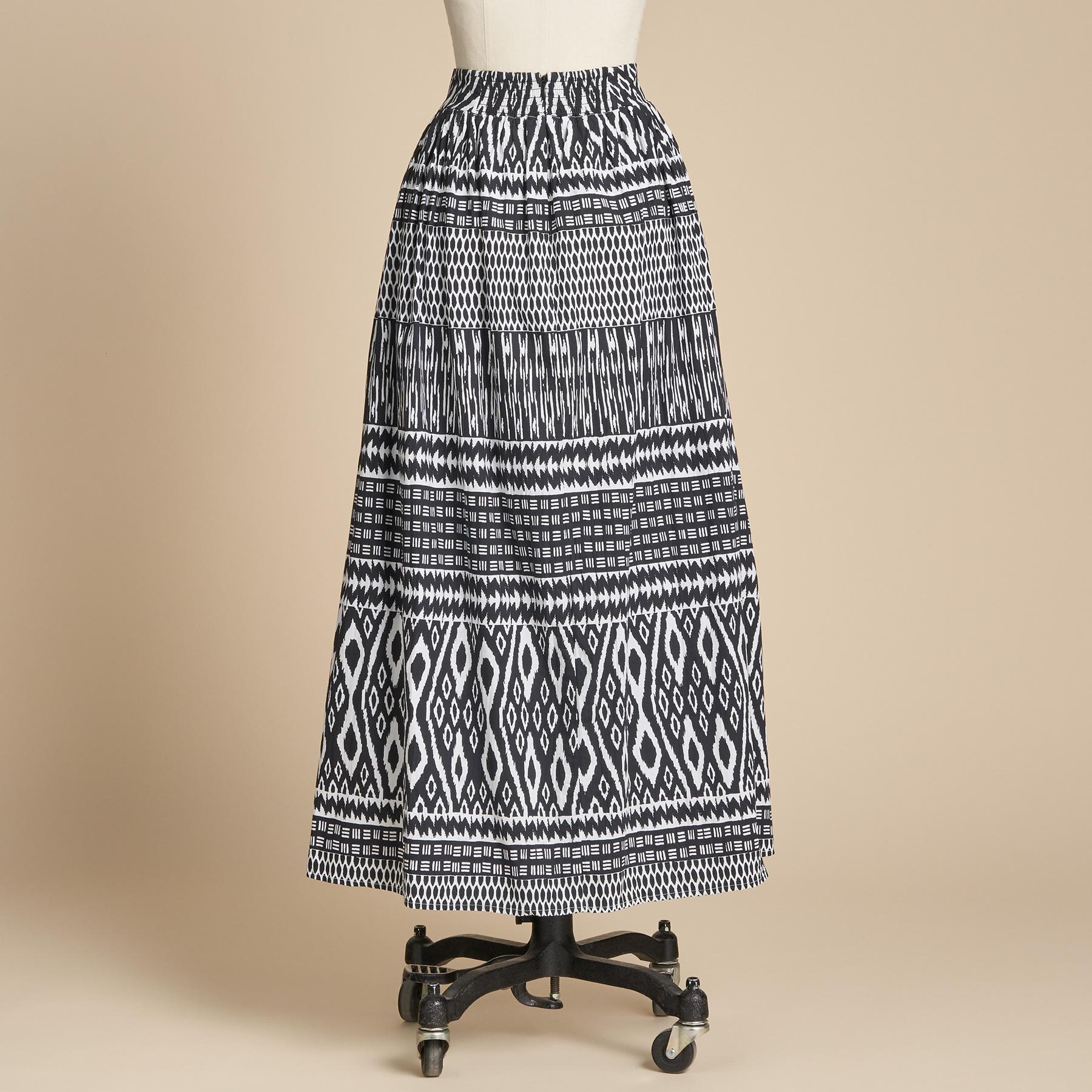Make a statement in our dramatic. full-length skirt in an artistic ikat print with a broomstick twist. High waist. back zip. back center elastic for comfort. two pockets. Lined. Cotton/spandex. Machine wash. Imported. Exclusive. Sizes XS (0 to 2). S (4 to 6). M (8 to 10). L (12 to 14). XL (16 to 18). XXL (20 to 22). Approx. 38L.