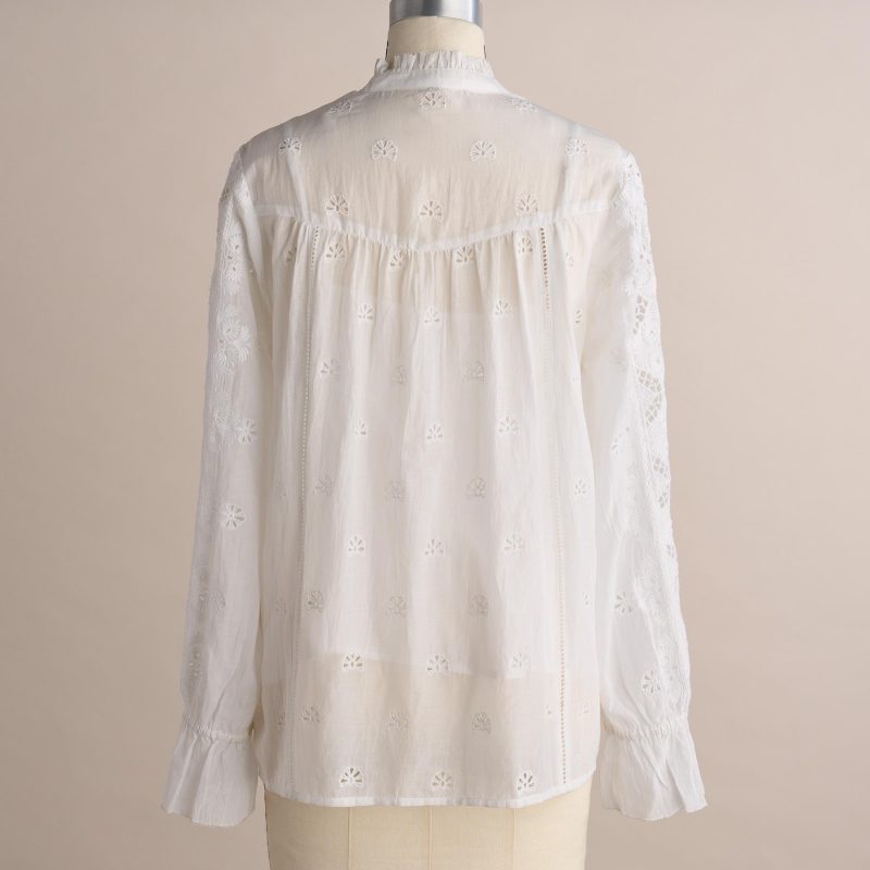 Allover floral embroidery graces our artistic ruffle sleeve top with shirring and ladder lace detail. Cotton/viscose. Hand wash. Imported. Exclusive. Sizes XS (0 to 2). S (4 to 6). M (8 to 10). L (12 to 14). XL (16 to 18). XXL (20 to 22). Approx. 26-1/2L.