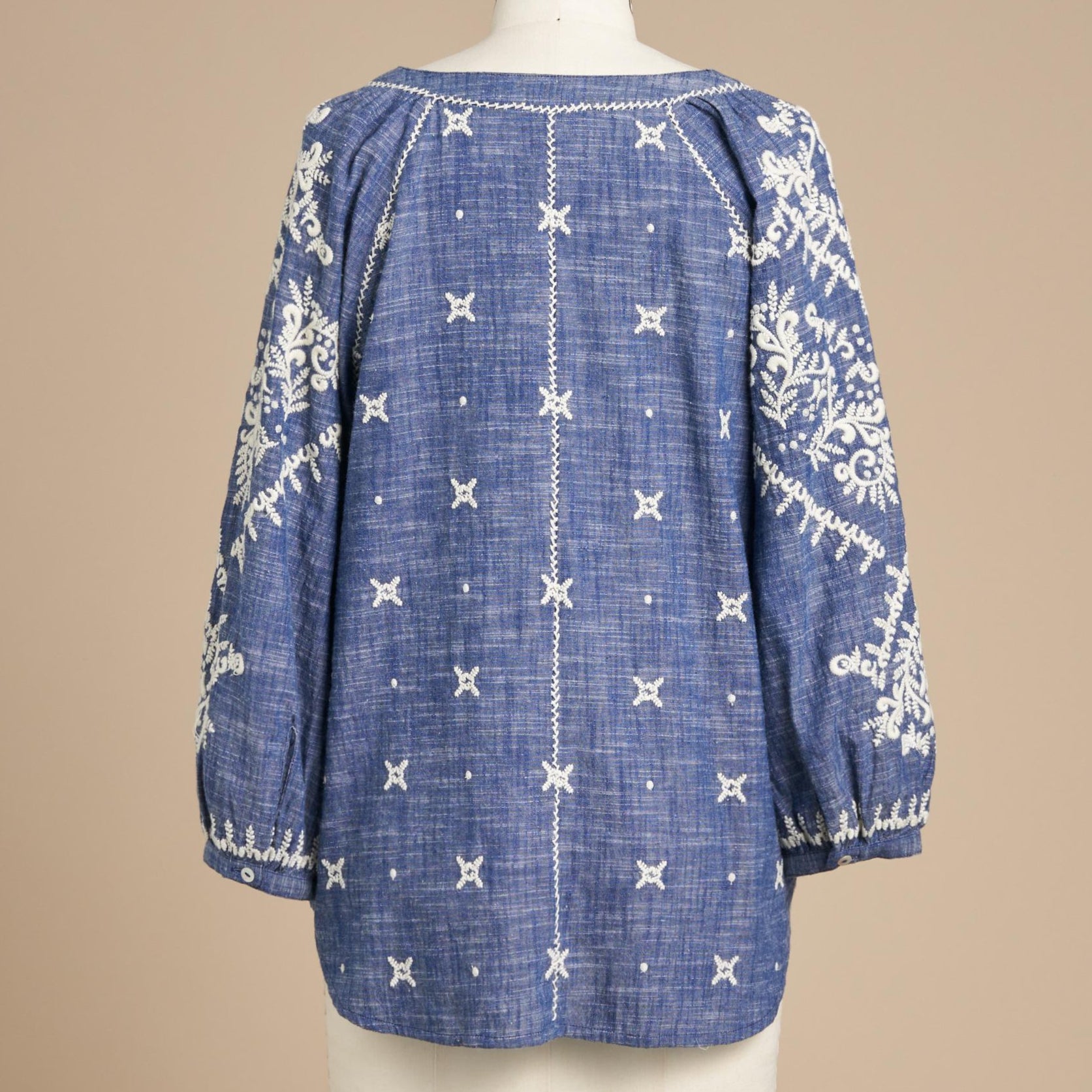 There’s joyful bohemian flair in this yarn-dyed top with luscious allover embroidery. blanket stitch details. three-quarter sleeves. shell buttons and V-neck. Full. easy fit. Cotton. Machine wash. Imported. Exclusive. Sizes XXS (00). XS (0 to 2). S (4 to 6). M (8 to 10). L (12 to 14). XL (16 to 18).Approx. 22-1/2L.
