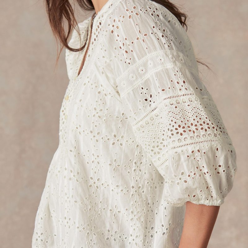 Tonal eyelet embroidery brings life to our relaxed top boasting bold. voluminous sleeves with elastic cuffs. ladder lace insets and shell buttons at the henley placket. Camisole included. Cotton. Machine wash. Imported. Exclusive. Sizes XXS (00). XS (0–2). S (4–6). M (8–10). L (12–14). XL (16–18). Approx. 23.5l.