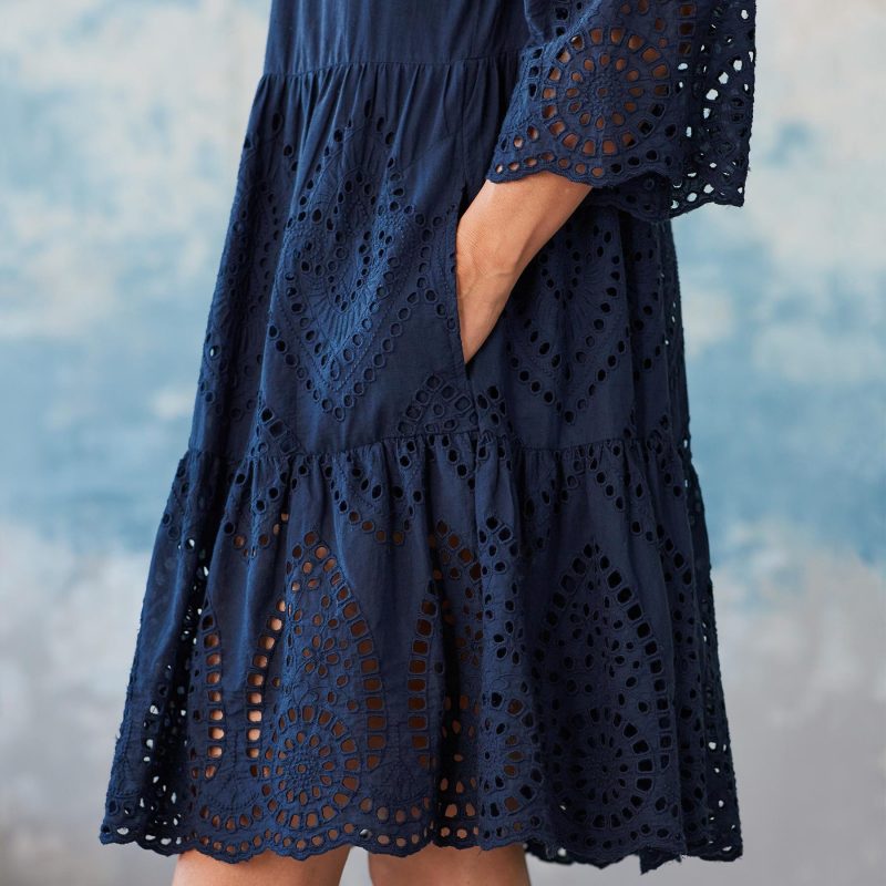 Captivating eyelet details and an appliqu??. notched neckline take this charming. tiered dress to transcendent heights. Cotton. Hand wash. Imported. Sizes XS (0 to 2). S (4 to 6). M (8 to 10). L (12 to 14). XL (16 to 18). XXL (20 to 22). Approx. 38-1/4L.