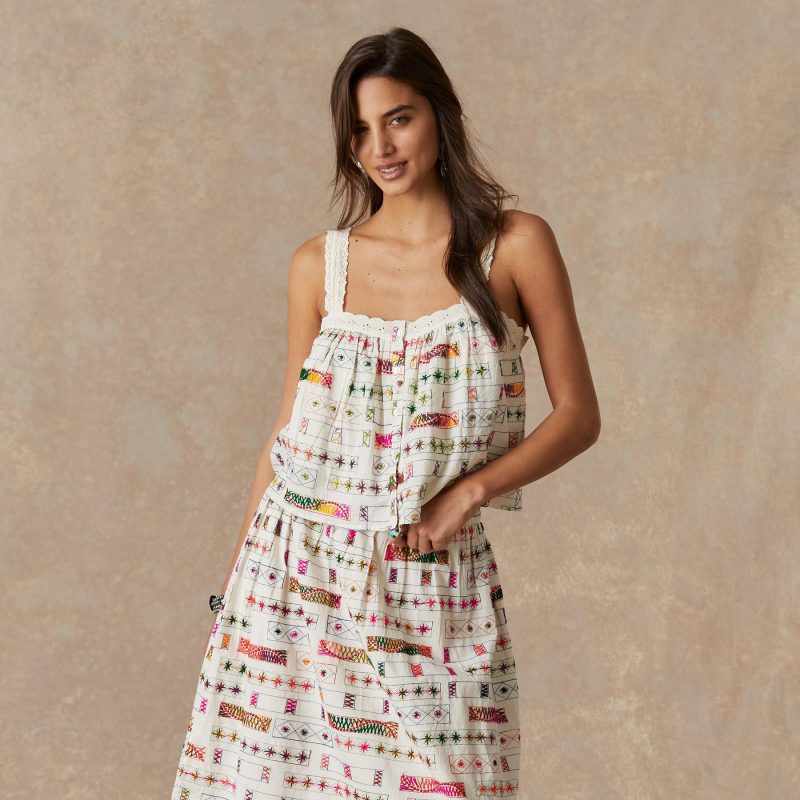 Lace straps and detail adorn this button-down tank with allover embroidery. Lined. Cotton. Hand wash. Imported. Sizes XS (0-2). S (4-6). M (8-10). L (12-14). Approx. 14l.