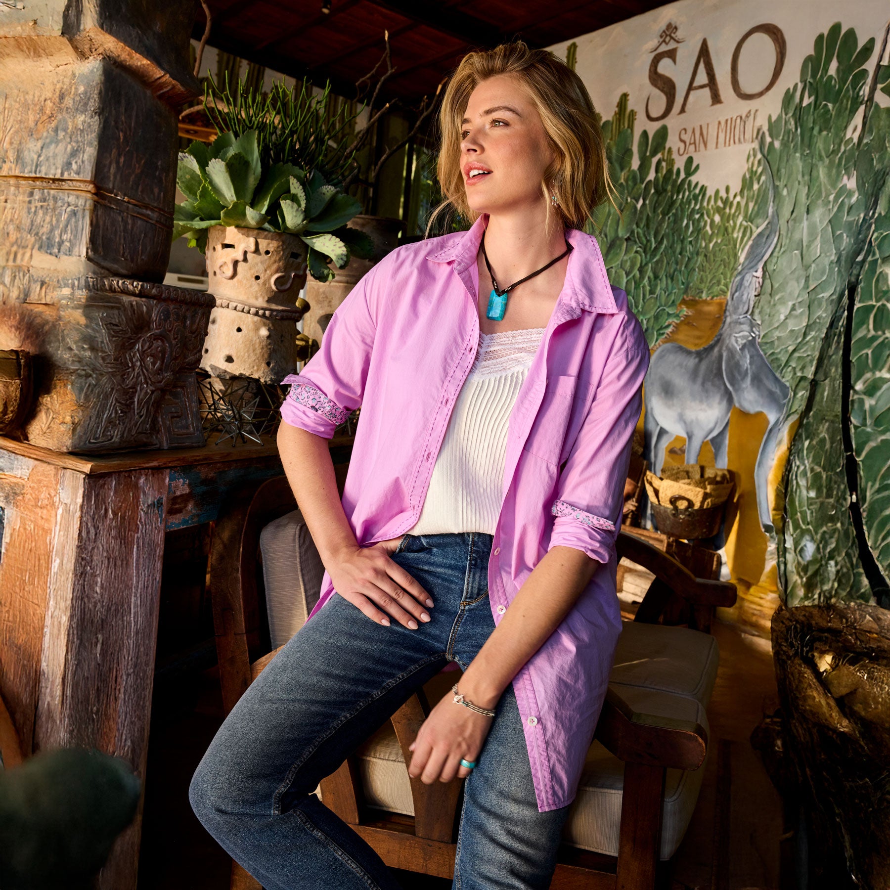 Just the right blend of comfort and style our oversized tunic is simple yet elegant—finished in special details. Chest patch pocket with pick-stitching. two side seam pockets and contrast print cuffs. Cotton. Hand wash. Imported. Exclusive. Sizes XS (0–2). S (4–6). M (8–10). L (12–14). XL (16–18). XXL (20–22). Approx. 33l.