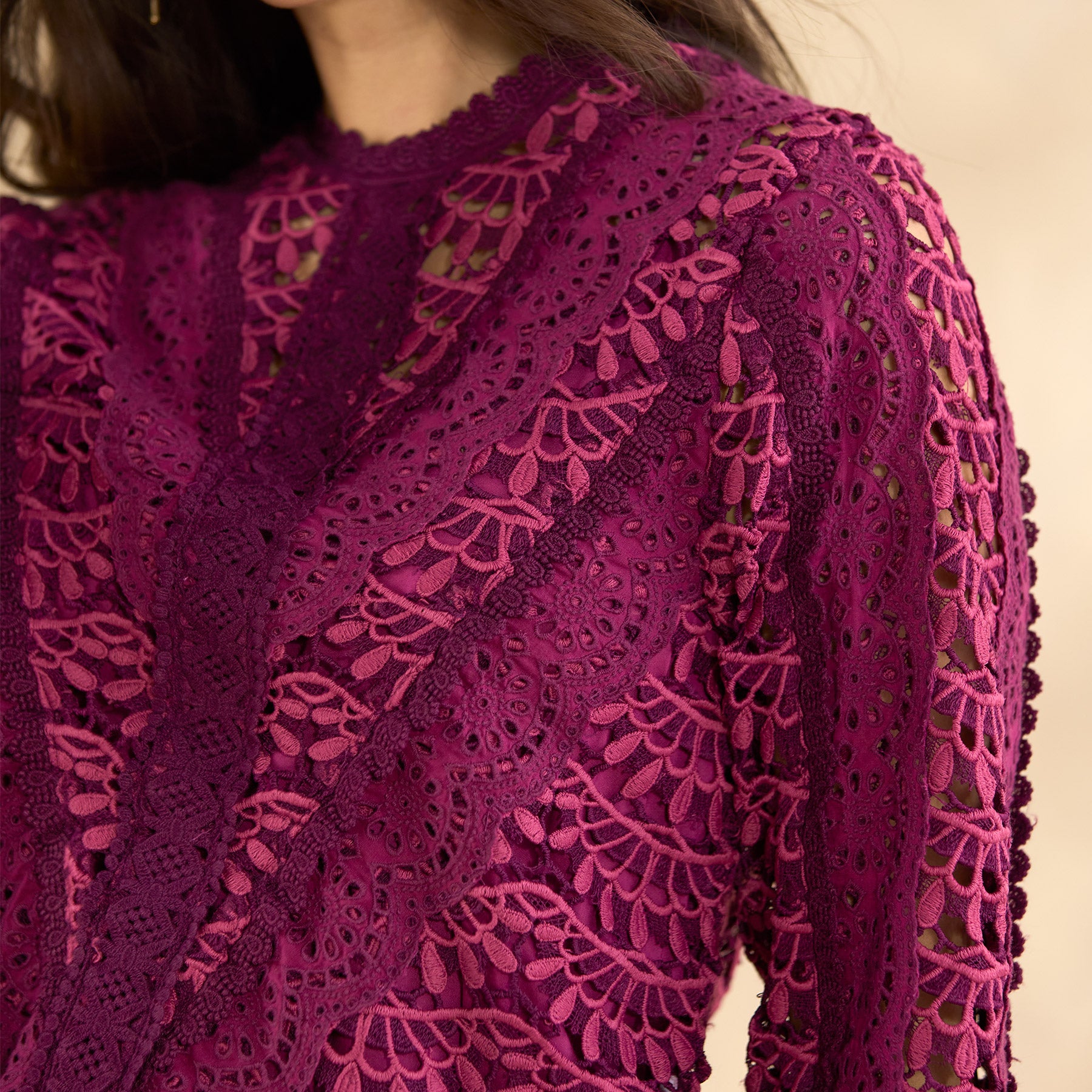 Luxurious allover lace adds elegance to every step of our detailed crocheted top with bold sleeves. scalloped bottom and so much texture. Invisible button closure at the back. Camisole included. Polyester/cotton/modal. Hand wash. Imported. Exclusive. Sizes XS (0?C2). S (4?C6). M (8?C10). L (12?C14). XL (16?C18). XXL (20?C22). Approx. 23.5l.