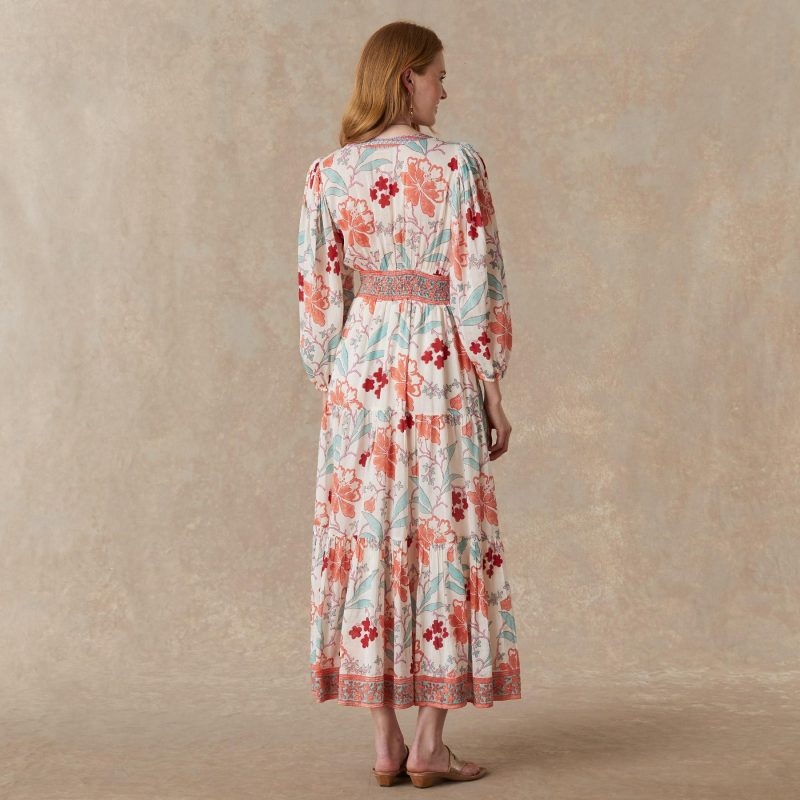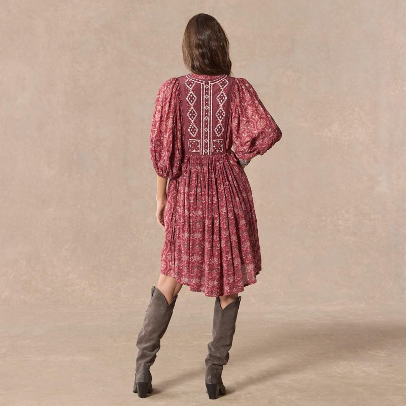 Our easy pop over dress is mixed printed and finished with stunning embroidery at the placket. a flattering V-notch neckline with three looped buttons and puff sleeves with elastic cuffs. Side ties to gather at the center front and back for the perfect fit. Cotton/viscose. Machine wash. Imported. Exclusive. Sizes XXS (00). XS (0??). S (4??). M (8??0). L (12??4). XL (16??8). Approx. 38.5l.