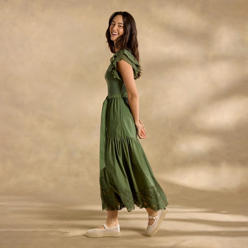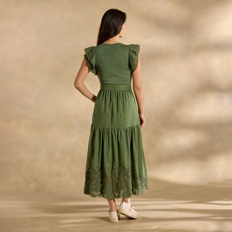The intricate tonal detail that defines our mixed-media Madera Dress demands a closer look! With a rib-knit bodice. poplin skirt and delicate chiffon cutout details throughout??plus ruffled sleeves. scoop neck. elastic waist and lined skirt. Cotton. Machine wash. Imported. Exclusive. Sizes XS (0-2). S (4-6). M (8-10). L (12-14). XL (16-18). XXL (20-22). Approx. 49l.