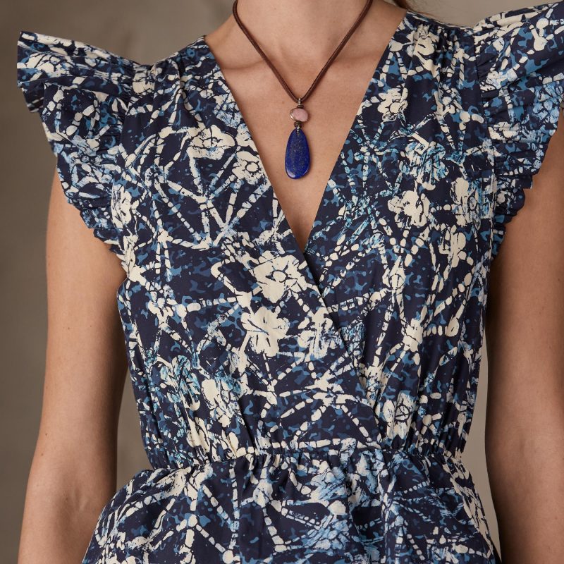 This distinctive party dress features a beautiful print. a V-neck in front and back. ruffled sleeves and asymmetric ruffled tiers. Full maxi length. Cotton. Machine wash. Imported. Sizes 2 to 16. Approx. 55-1/2L.