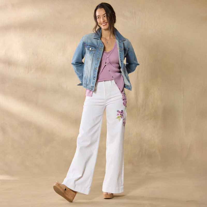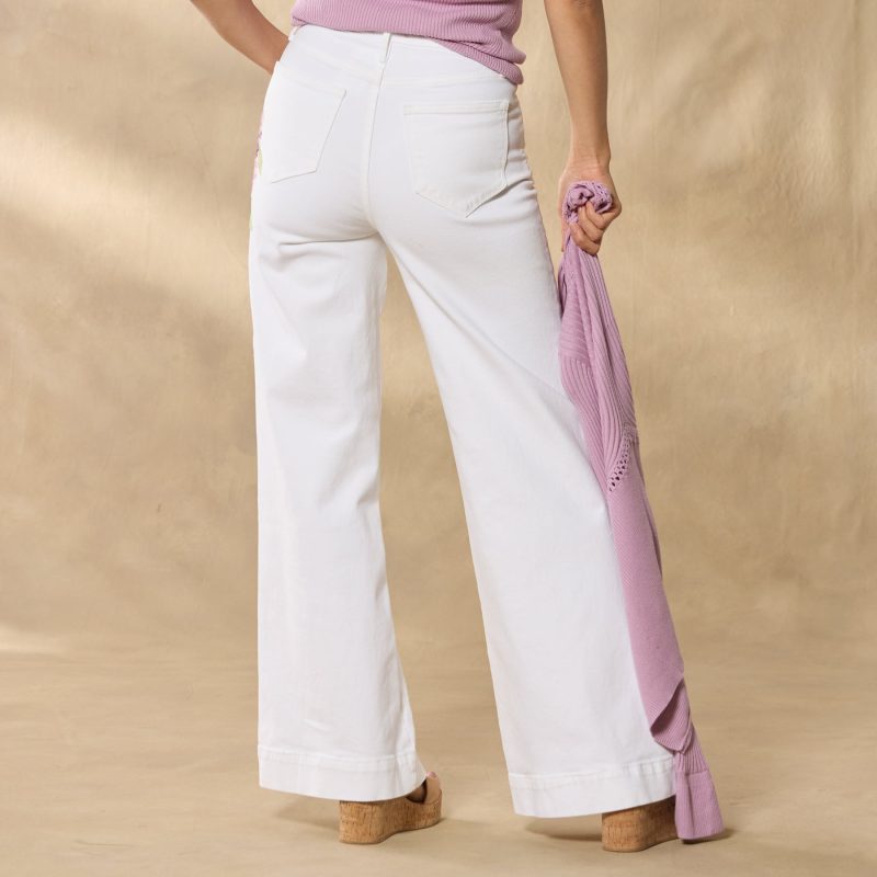 The breeziest wide-leg pants. artfully embellished with beautiful embroidery. Five-pocket styling. Cotton/polyester/spandex. Machine wash. Imported. Sundance exclusive. Sizes 24?C32. 30. 32 or 34 inseam; 11 rise; 26 leg opening.