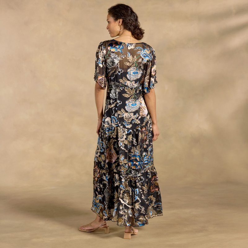 This stunning. iridescent. burnout velvet dress features a v-neck. short sleeves and tie at the waist. Slip included. Viscose/silk/polyester/spandex. Dry clean. Imported. Exclusive. Sizes XS (0?C2). S (4?C6). M (8?C10). L (12?C14). XL (16?C18). XXL (20?C22).