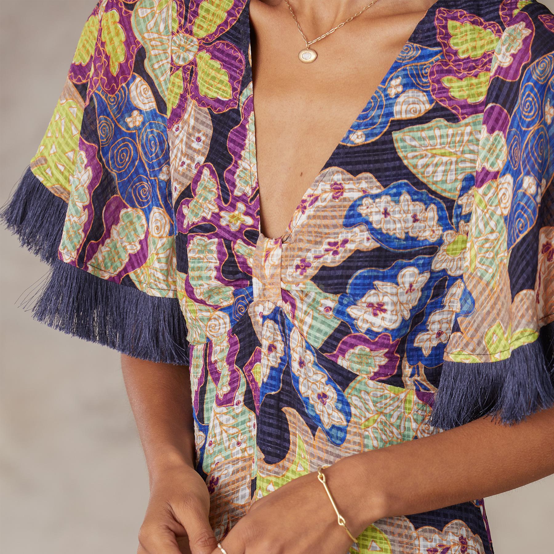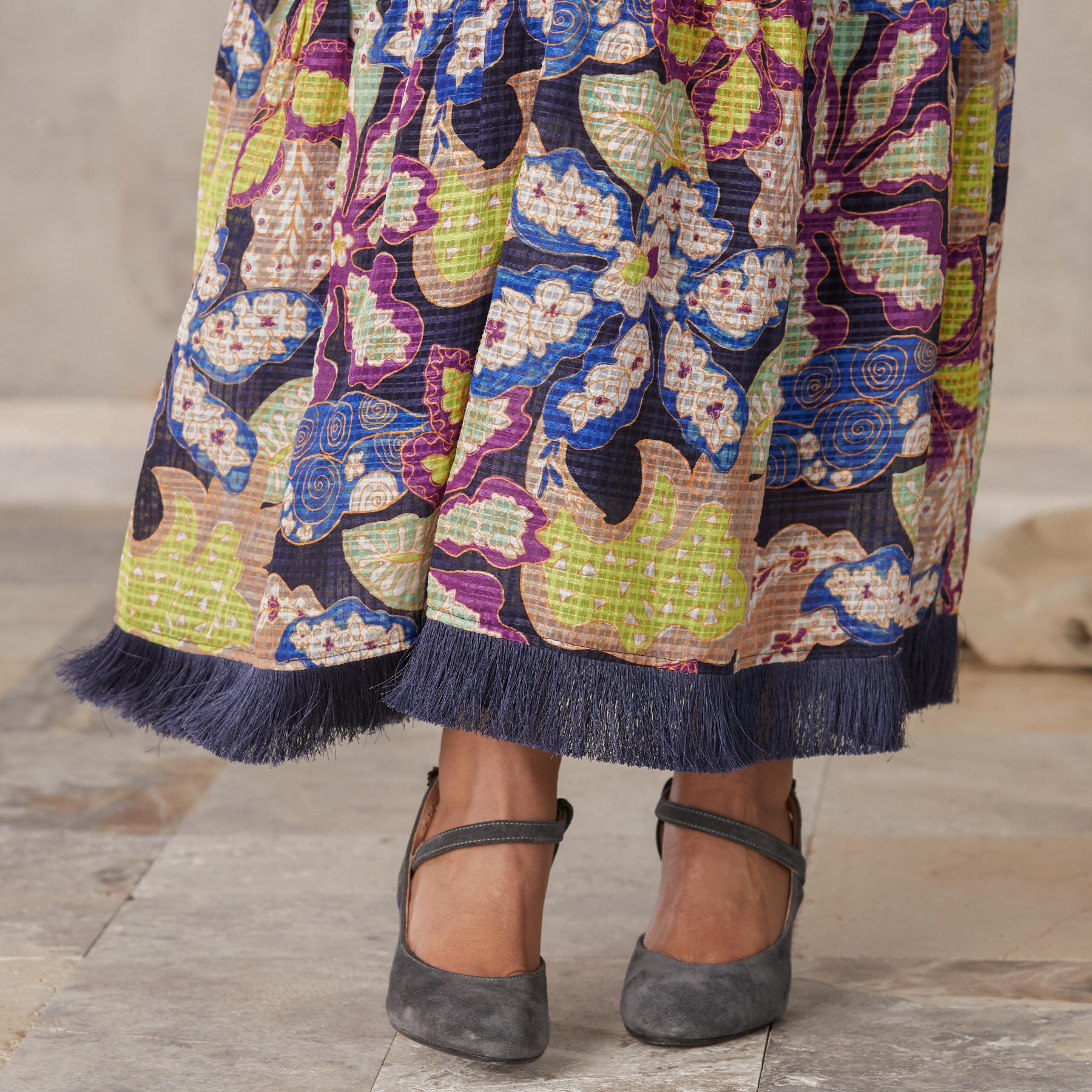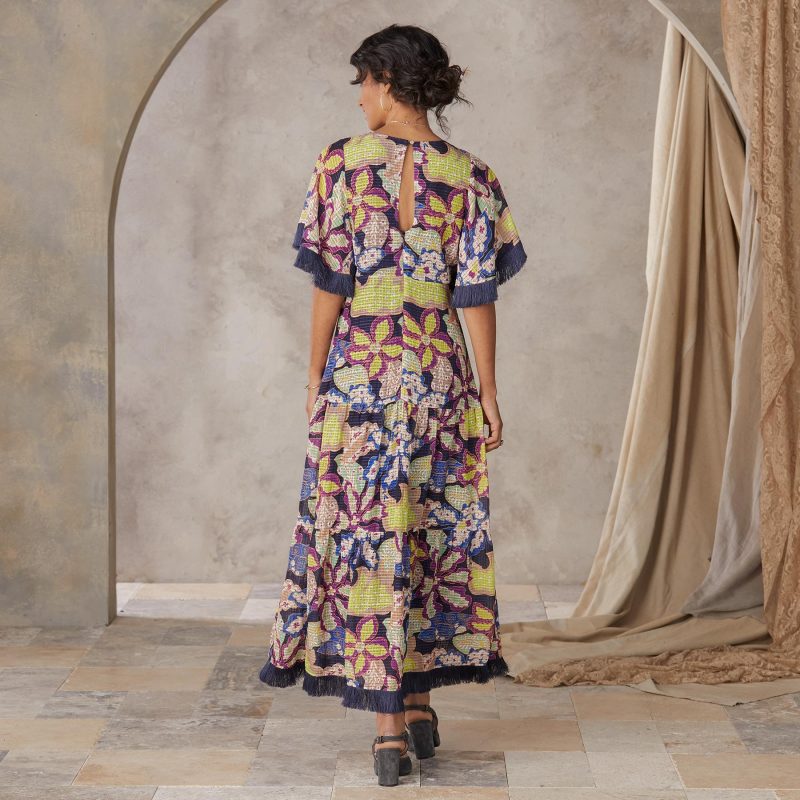 Expressive fringe at the sleeve and hem create movement on this distinctive maxi dress. Keyhole back. Linen/viscose. Dry clean. Imported. Sizes 2-16. Approx. 53l.