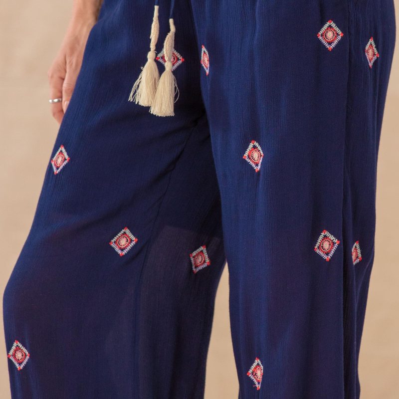 Our Niovi Pants are fashioned from the most delightful crinkle rayon crepe for the easiest. breeziest lightweight feel. In a cropped. wide-leg silhouette. with colorful allover embroidery and crochet tassel detail on elastic waistband tie. Great travel pants! Hand wash. Imported. Exclusive. Sizes XS (0?C2). S (4?C6). M (8?C10). L (12?C14). XL (16?C18). XXL (20?C22). 23 inseam.