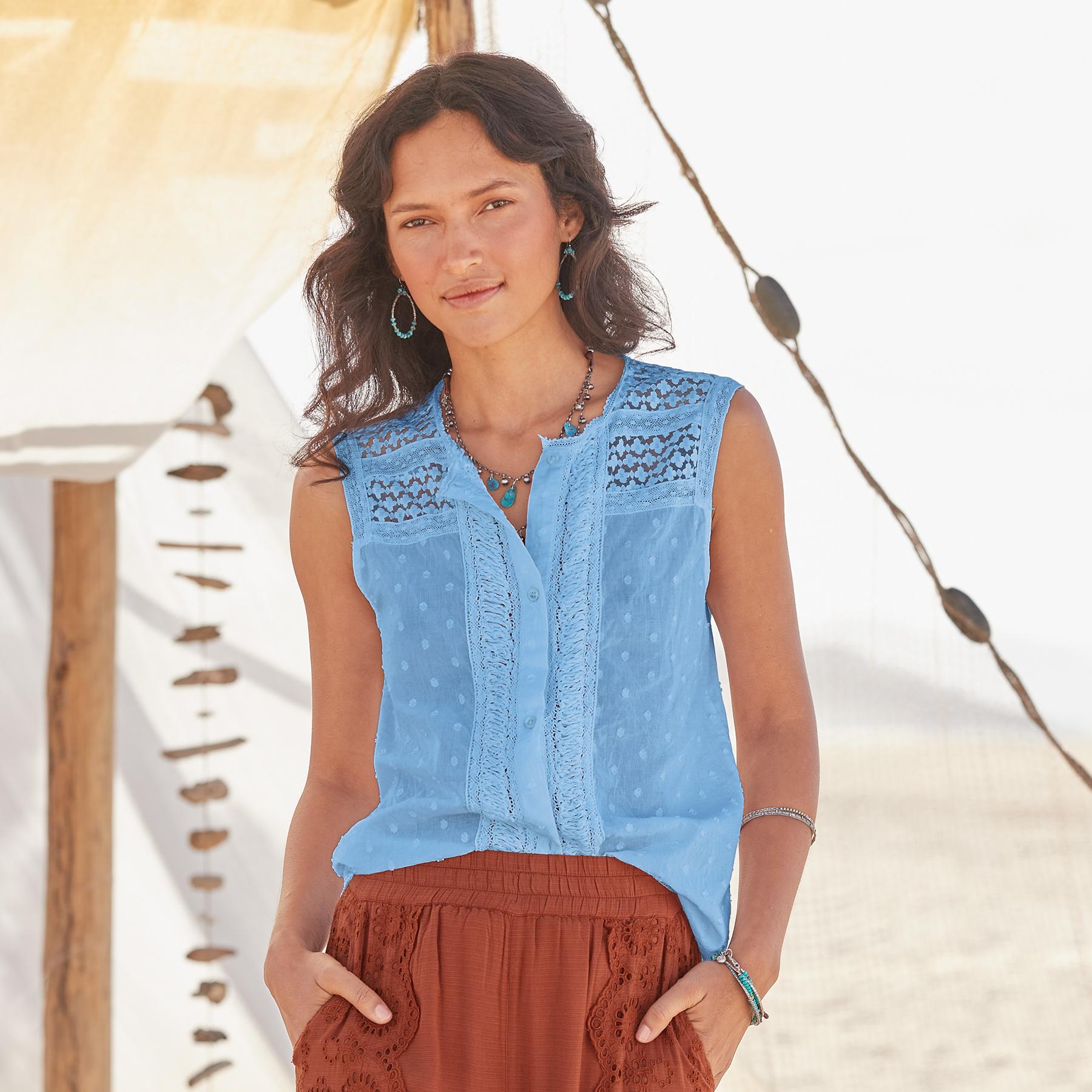 Feminine and textured. our special button down shell is a classic elevated. full of beautiful details with lace yoke. unique trim detail at the center front placket and shirring at the back. Cotton. Machine wash. Imported. Exclusive. Sizes XS (0–2). S (4–6). M (8–10). L (12–14). XL (16–18). XXL (20–22). Approx. 24l.