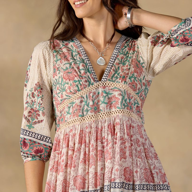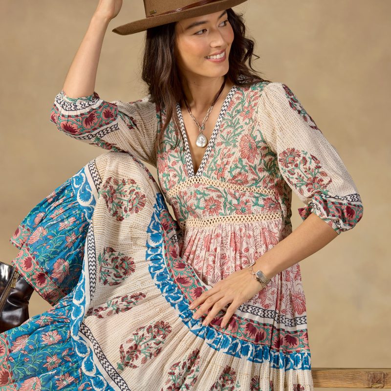 A love letter to bohemian style. our Peacock Flare Midi Dress is full of special details??including handcrafted stitching on the bodice. pretty puffed sleeves and a bouquet of complementary floral prints spanning three twirly tiers. Popover with drawstring. Cotton. Hand wash. Imported. Sizes S/M (0?C6). M/L (8?C12). XL (14?C18). Approx. 46l.