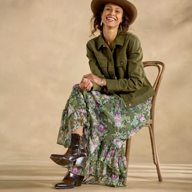 Sure. our Rhodes Jacket is technically a utility jacket. But there’s nothing basic about its trim. flattering fit??or the delicate tonal embroidery over the front patch pockets. down the sleeves and across the back yoke. Love this design? Check out the Rhodes Pants! Cotton/rayon. Machine wash. Imported. Exclusive. Sizes XS (0-2). S (4-6). M (8-10). L (12-14). XL (16-18). XXL (20-22). Approx. 21l.