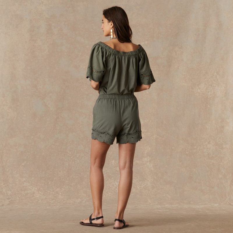 Cool and relaxed. these shorts match our Stevie top and have an elastic waist with tie. cut-out detail and embroidery. Cotton. Machine wash. Imported. Sizes XS (0-2). S (4-6). M (8-10). L (12-14). XL (16-18). XXL (20-22). 5 inseam. 13.5 leg opening.