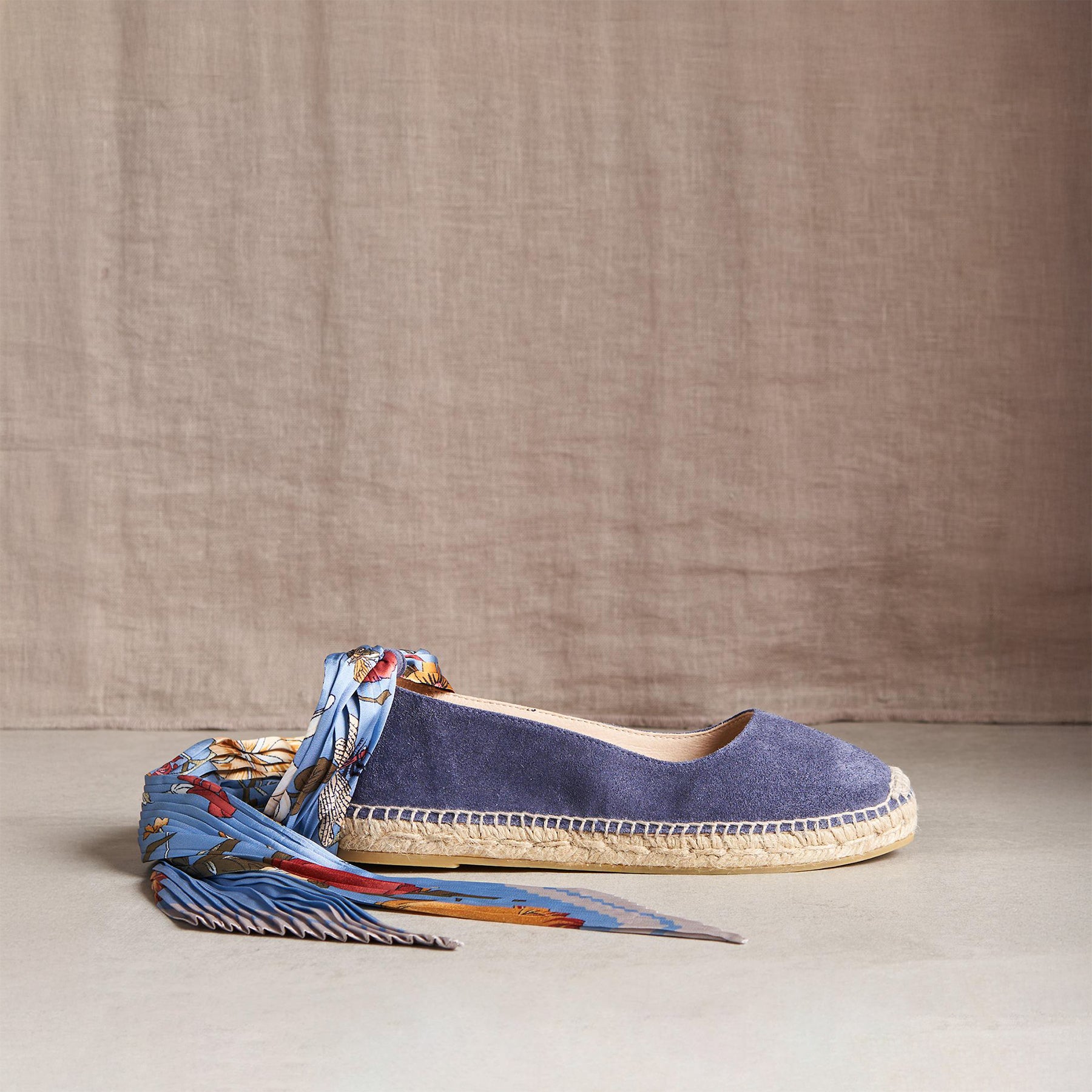 These true espadrilles feature a removable pleated scarf that functions as an ankle tie. Leather-lined. cushioned insole. Suede. Spain. Exclusive. Whole sizes 36-41. 36 (US 5.5). 37 (US 6). 38 (US 7). 39 (US 8). 40 (US 8.5). 41 (US 9.5).
